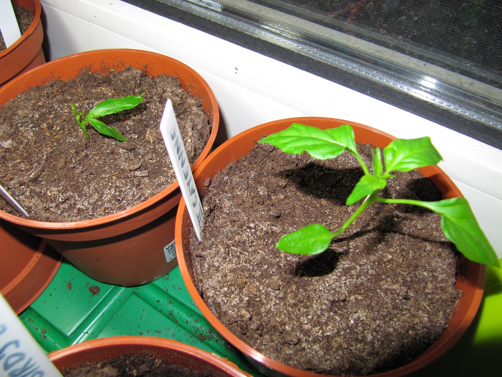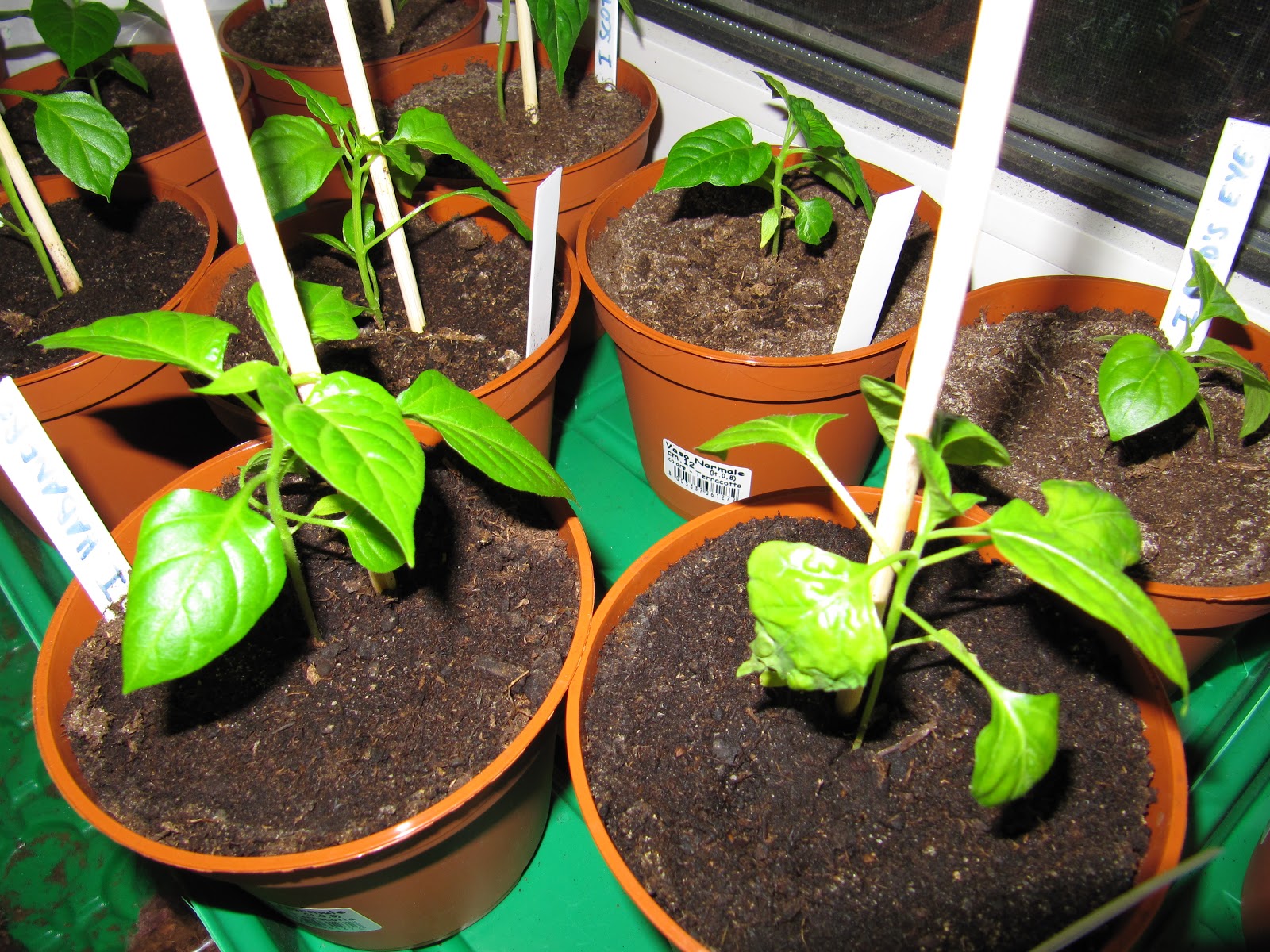 Das hier sind die jüngsten Keimlinge, die im Moment noch direkt unter der Energiesparlampe stehen bis sie umgetopft werden. Hier waren einige Hutträger dabei, deshalb sehen die noch nicht ganz so fit aus, aber sie werden bestens gepflegt und bis auf eine Habanero bin ich mir ziemlich sicher, dass sie sich wieder erholen.